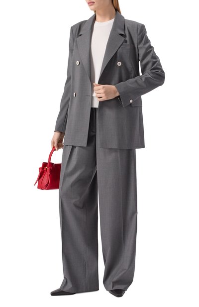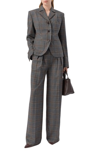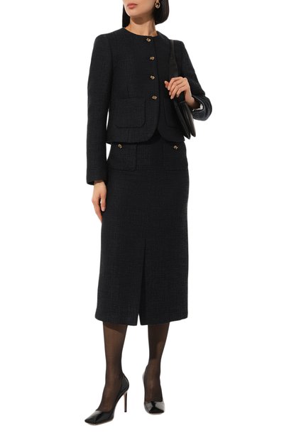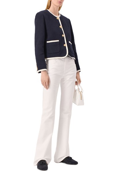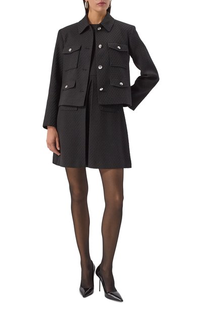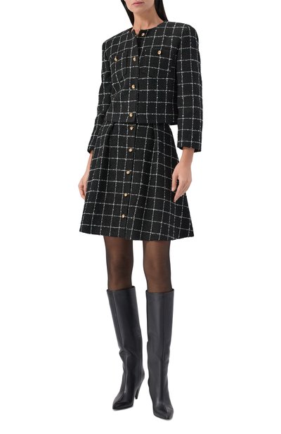 Жакет из полушерстяного твида с узором «гусиная лапка» будет органично смотреться и в офисном, и в повседневном комплекте. Модель с однотонным кантом дополнили накладными карманами и золотистыми брендированными пуговицами.