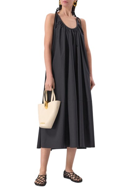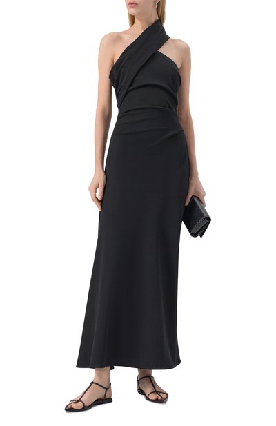 Приталенное миди-платье сшили из вискозного трикотажа с добавкой шерсти. Модель с молнией на спинке и узкими регулируемыми бретелями, концы которых ниспадают сзади, дополнили вставкой со встроенными косточками, имитирующей выступающее бра.