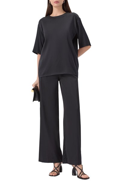 Брюки со стрелками справятся с многозадачностью в гардеробе. Например, пуловер поможет этой модели с классической посадкой прописаться в городе, а блуза адаптирует изделие для офиса. Для пошива использовали вискозу с добавлением нейлона и эластана.