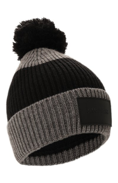 Шапку бини в широкую черно-серую полоску связали из акриловой пряжи с добавлением шерсти. Гамму поддержали помпоном из такого же материала и брендированным патчем на отвороте.