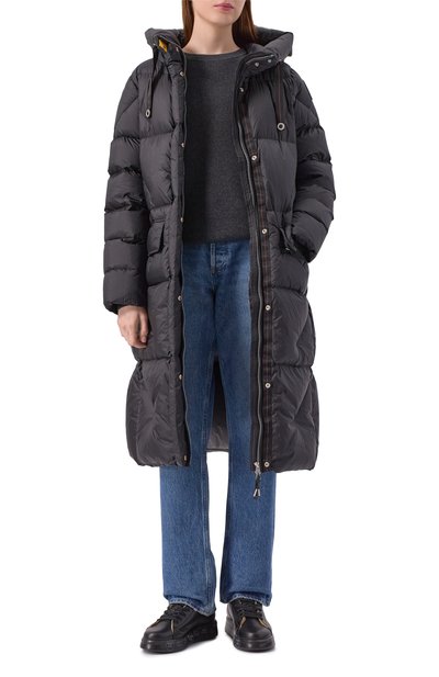 Удлиненный стеганый пуховик с брендированной пластиной на капюшоне сшили из влагоотталкивающего нейлона. Модель со встречной молнией утеплили гусиным пухом. Боковые карманы и манжеты застегиваются кнопками.