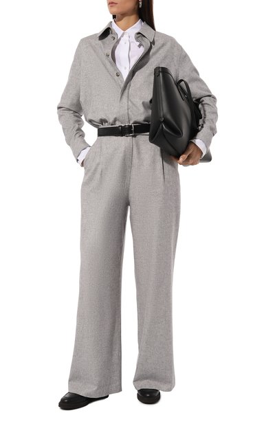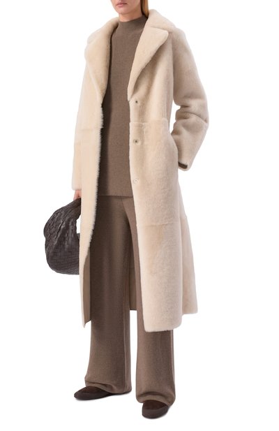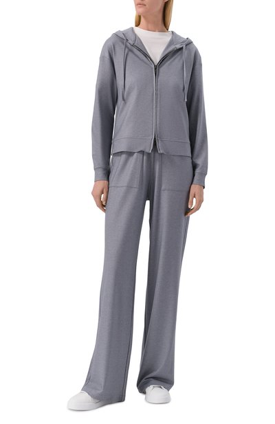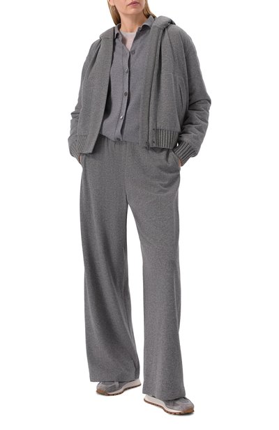 Кашемировые брюки с широким эластичным поясом в рубчик дополнили боковыми карманами. Модель станет основой комфортного повседневного образа с парным кардиганом.