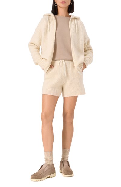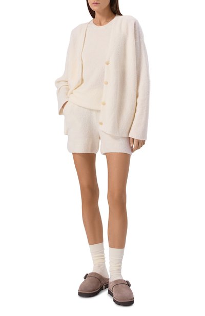Мини-шорты с боковыми карманами станут основой непринужденного образа с парным кардиганом и сабо. Кашемировую модель крупной вязки дополнили эластичным регулируемым поясом-кулиской.