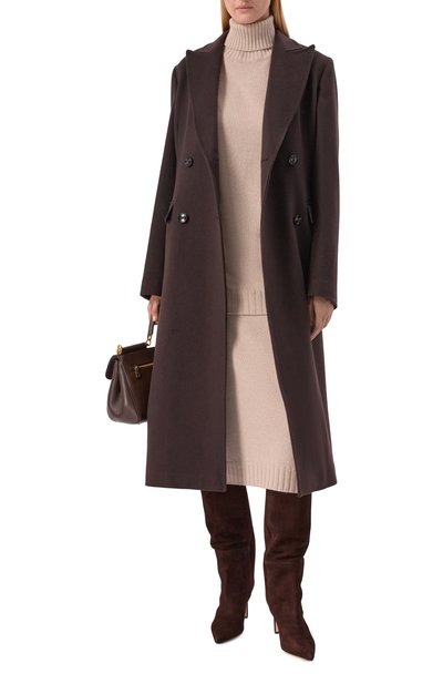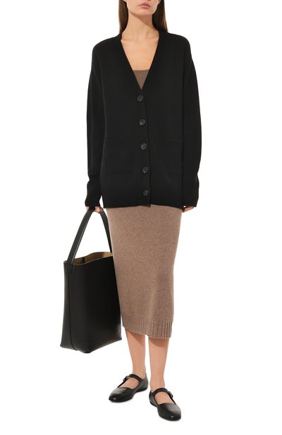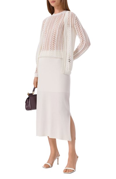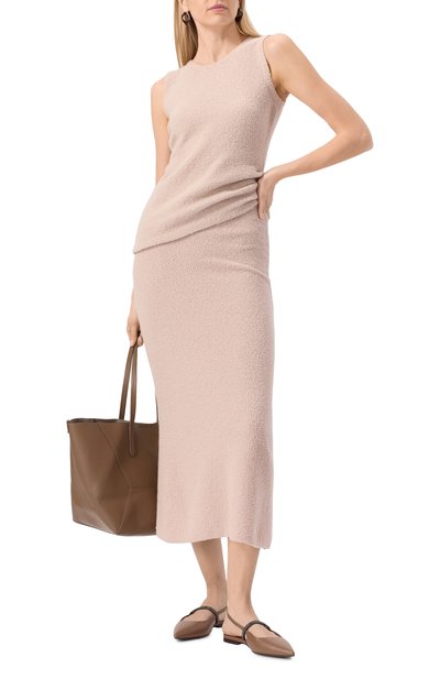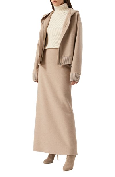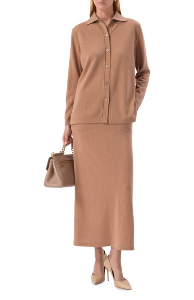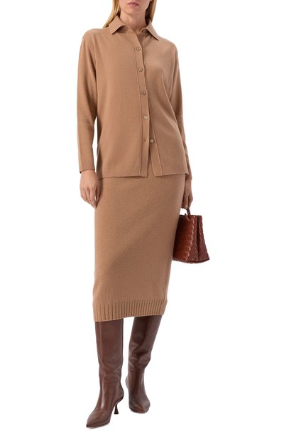 Миди-юбка из кашемирового трикотажа поможет создать элегантный и вместе с тем комфортный образ, например, с парным кардиганом и рубашкой. Слегка расклешенную модель с эластичным поясом дополнили боковыми карманами с краями в рубчик.