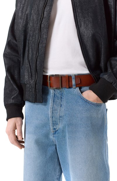 Эластичный ремень сплели из текстильных шнуров, поэтому ремень обходится без прорезей. Края укрепили кожей в тон. Пряжку и накладку в форме акульего плавника, которой украсили шлевку, выполнили из металла.