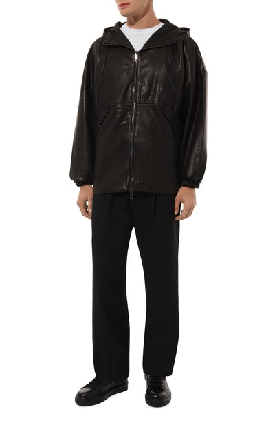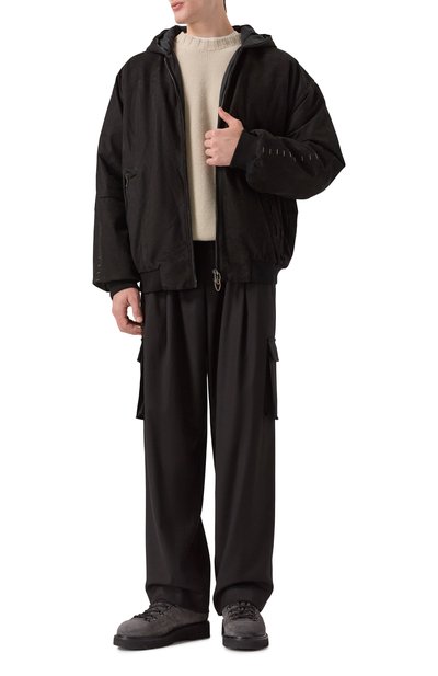 Бомбер с внутренним и внешними карманами выполнили из гладкой кожи растительного дубления. Модель с вискозным подкладом, застегивающуюся встречной молнией, дополнили эластичной отделкой с явными потертостями и декоративными разрывами.
