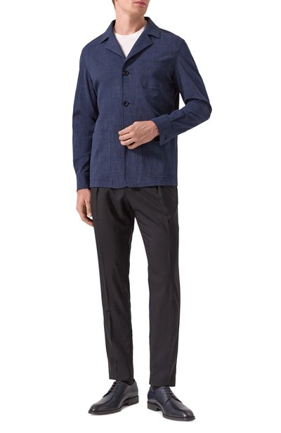 Для пошива двубортного пиджака выбрали деним из чистого хлопка. Модель с боковыми карманами выполнили без подклада, поэтому она формирует мягкий силуэт.