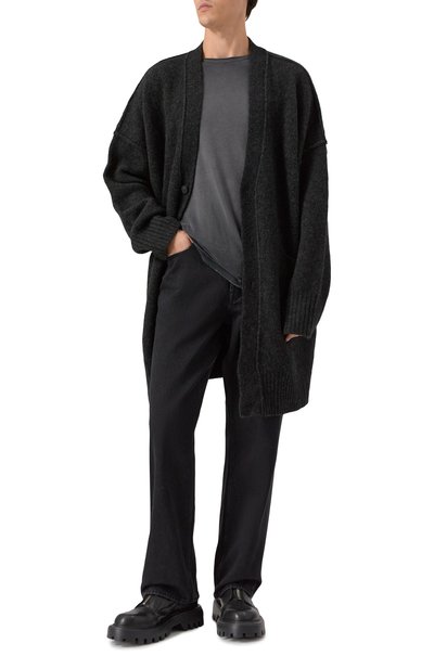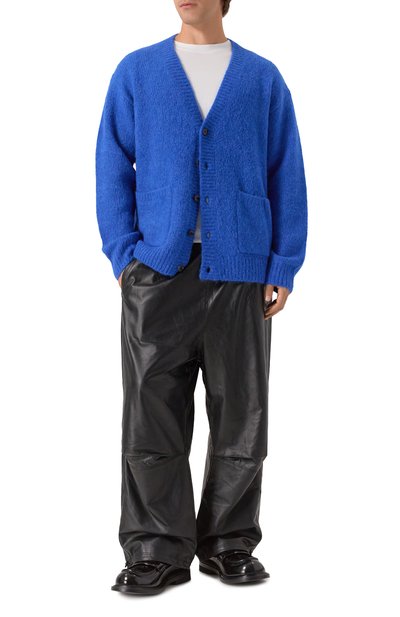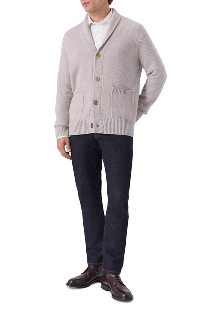 Для изготовления кардигана с двумя крупными накладными карманами использовали пряжу с добавлением мериносовой шерсти и нейлона. Модель со слегка спущенной линией плеч дополнит повседневный образ, например, с футболкой, брюками-карго и лоферами.