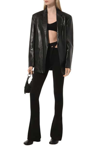 Расклешенные брюки с низкой посадкой выполнили из мягкого эластичного текстиля, полностью расшитого глянцевыми пайетками. Широкий пояс-резинку, как у спортивных моделей, украсили спереди и сзади крупным контрастным логотипом в готическом стиле.