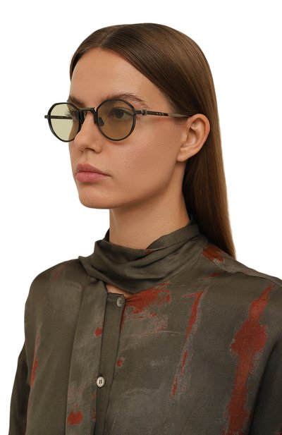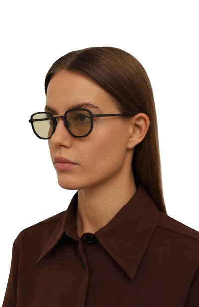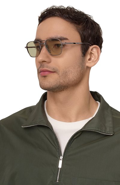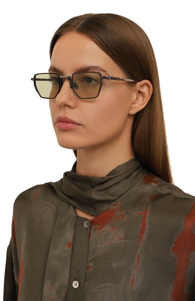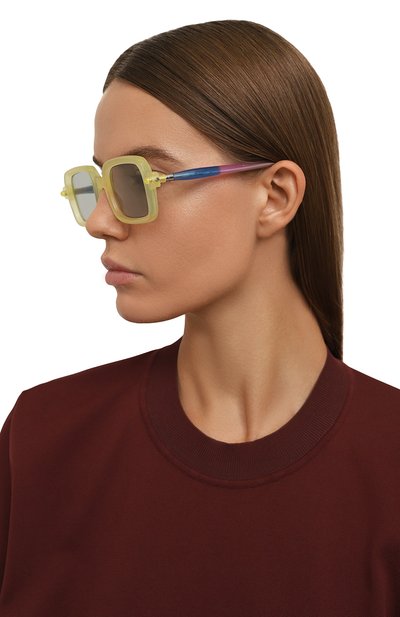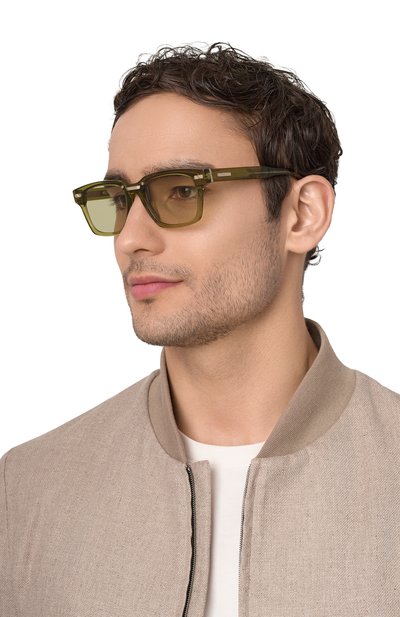 В коллекцию Intarsia Rays вошли очки в оправе из полупрозрачного ацетата. По бокам аксессуар украсили заклепками-ромбами, а заушники подчеркнули металлическими накладками с узором и монограммой BC. Аксессуар с литыми носоупорами дополнили градиентными стеклянными линзами, полностью блокирующими ультрафиолет.