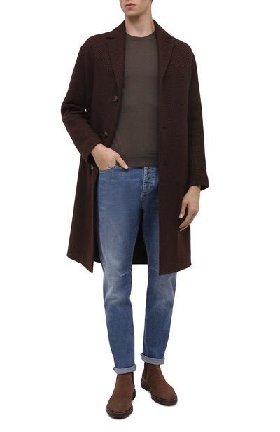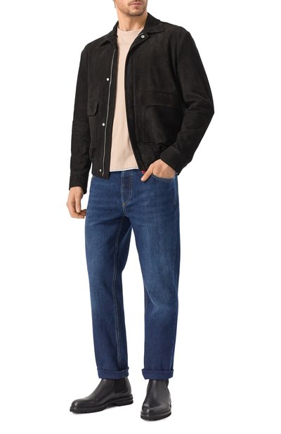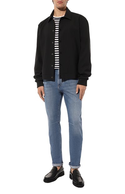 Слегка зауженные джинсы выбелили и декорировали небольшими потертостями, придав винтажный вид. Для изготовления модели с вышитой эмблемой Solomeo на монетном кармане и патчем с логотипом сзади использовали эластичный деним.