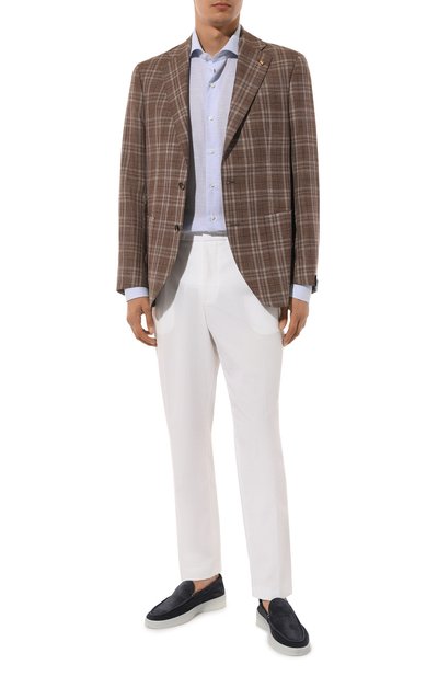 Пиджак в крупную клетку выполнили из шерсти с добавлением полиэстера. Изделие дополнили внутренним и тремя внешними карманами, выкроив накладные так, чтобы совместить графичный узор на них с орнаментом на передних полочках.