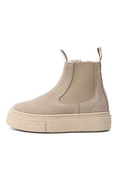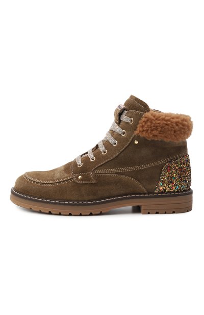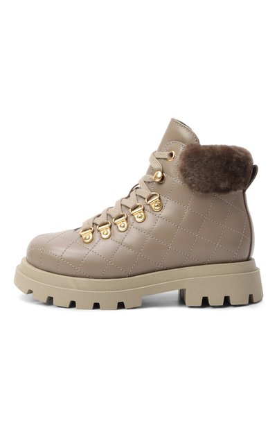Высокие ботинки с отделкой из резины, утепленные пуш истой овчиной, выполнили из гладкого полиэстера с перламутровым блеском. Пару на широкой протекторной подошве дополнили молнией сбоку и двумя регулируемыми ремешками велкро на голенище.