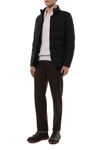 Ботинки с D-образными люверсами для шнуровки сшили из зернистой оленьей кожи. Модель с миндалевидным мысом и петлей на заднике дополнили кантом из ворсистого текстиля по краю выреза. Пару на многослойной подошве с глубоким противоскользящим протектором декорировали фирменной нашивкой на язычке.