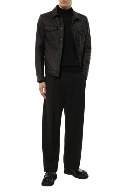 Нейлоновую куртку рубашечного кроя утеплили тонким слоем синтетического наполнителя. Модель с нагрудными карманами застегивается кнопками.