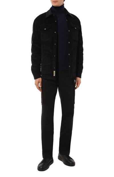 Чуть зауженные брюки из эластичного хлопкового вельвета с добавлением лиоцелла дополнены шестью карманами: боковыми прорезными, задними с клапанами и объемными карго. В кулиску эластичного пояса продета фирменная репсовая лента с пластиковым фастексом.
