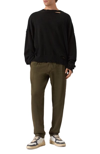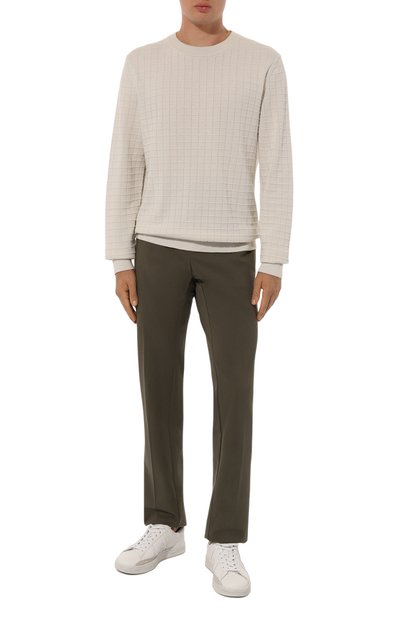 Брюки из эластичного хлопкового твила дополнили шестью карманами: боковыми, задними прорезными с клапанами и карго. Посадка на талии регулируется лентой грогрен с пряжкой и брендированным наконечником, продетой в пояс-кулиску.