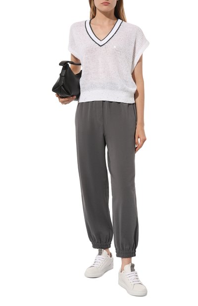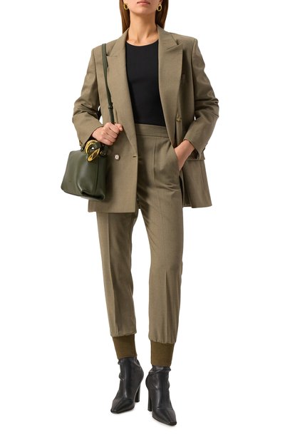 Для пошива зауженных джоггеров с боковыми и прорезными задними карманами использовали тонкий шерстяной твил стрейч. Модель с широким полосатым поясом-кулиской из эластичного рифленого трикотажа украсили сзади фирменной миниатюрной звездой.