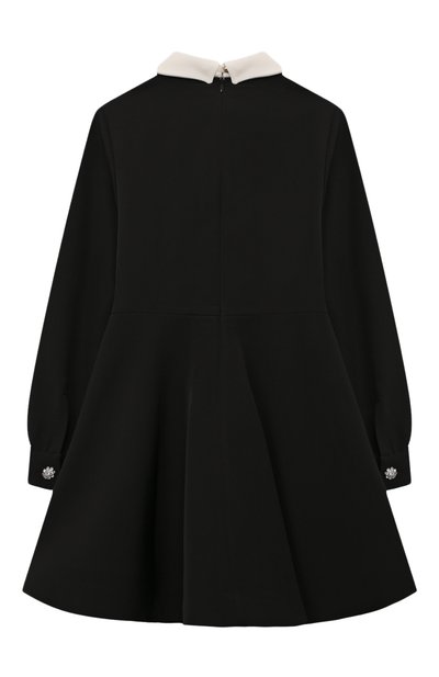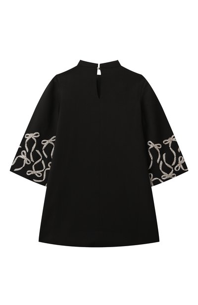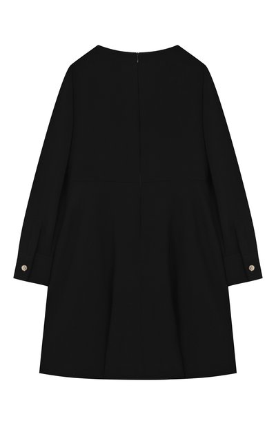 Для пошива платья с потайной молнией сзади использовали эластичный креп. Отделке из кристальных лент на талии и по краю накладных карманов вторит скульптурный бант на круглом вырезе. Модель украсили ажурной металлической эмблемой.