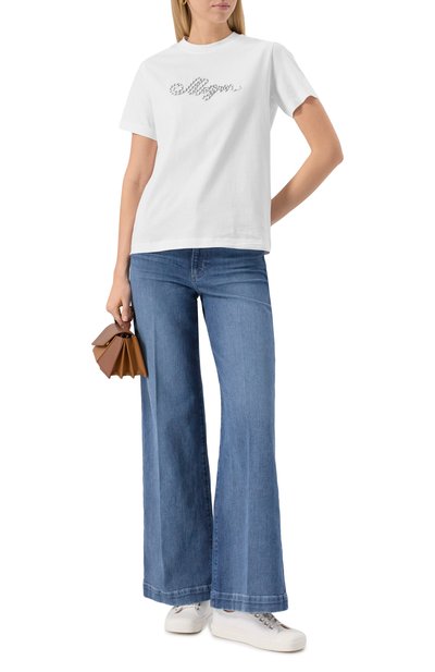 Свободную футболку из хлопкового джерси украсили крупным логотипом 3D спереди. Фактурный принт в виде фирменного смайла и баскетбольной корзины сзади подчеркнули кристаллами и пайетками.
