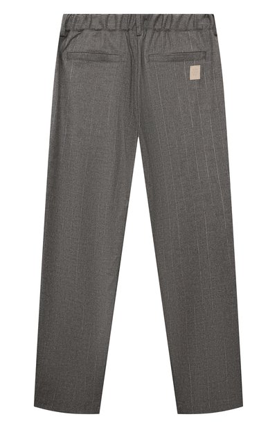 Брюки в тонкую вертикальную полоску выполнили из ткани на основе вискозы и шерсти. Пояс дополнили кулиской, в которую продели шнурок. Модель с четырьмя карманами и небольшой нашивкой сзади впишется в нестрогий школьный образ.