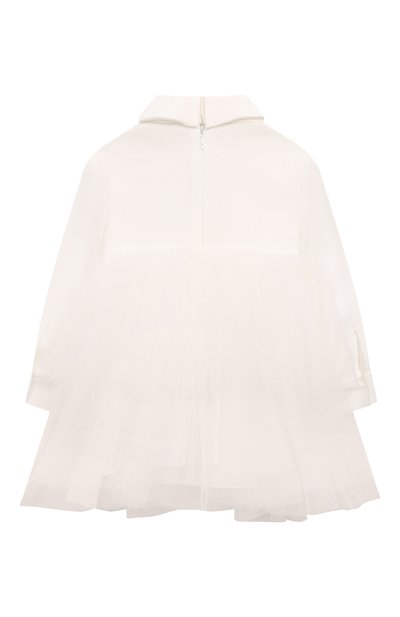 Платье с отложным воротником, длинными рукавами и пышным многослойным подолом из тюля станет основой праздничного образа ребенка. Модель, застегивающуюся молнией сзади, выполнили из гладкого матового кади. Слева на груди – эмблема марки, вышитая золотистой нитью.