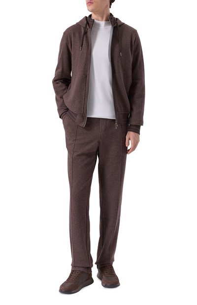 Для создания чуть зауженных брюк с прошитыми стрелками и тремя карманами использовали трикотаж, в котором соединили хлопок, кашемир и полиамид. Контрастным цветом выделили эластичный пояс-кулиску.