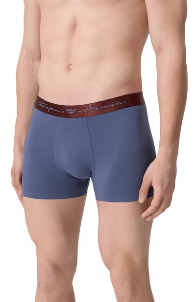 Боксеры с логотипом Megalogo на широкой резинке входят в экологичную линию Armani Sustainability Values. Для пошива облегающих трусов использовали органическое хлопковое джерси с добавлением эластана.
