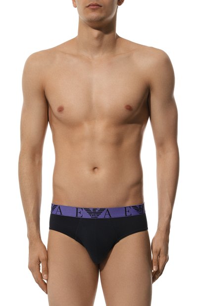 Брифы выполнили из гладкого хлопкового трикотажа с добавлением эластана. В комплекте — трое трусов с брендированными поясами разных цветов.