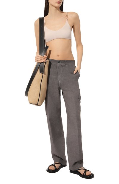 Меланжевые брюки с боко выми карманами и вытачками на манжетах, формирующими овальный силуэт, сшили из фактурной полушерстяной фланели. Фигурный пояс с V-образным вырезом по центру сзади, обеспечивающим комфортную посадку, украсили вышитой монограммой EA.