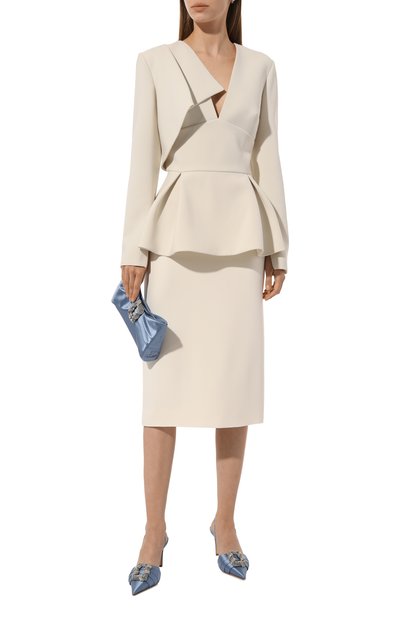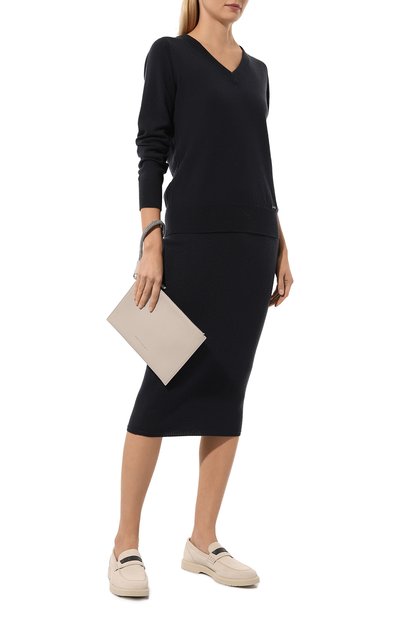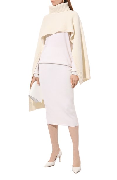 Кашемировую юбку-карандаш дополнили узким кантом и широким эластичным поясом в рубчик. Модель с металлической брендированной пластиной сбоку составит идеальный дуэт с парной водолазкой.