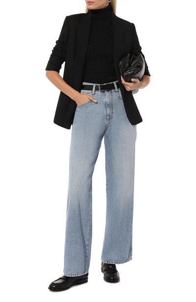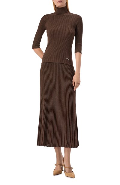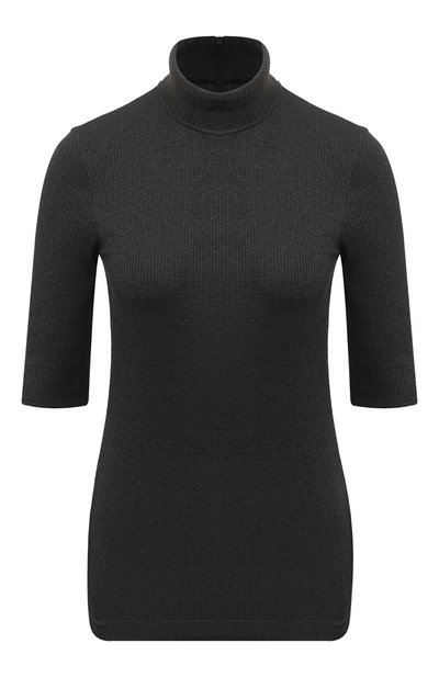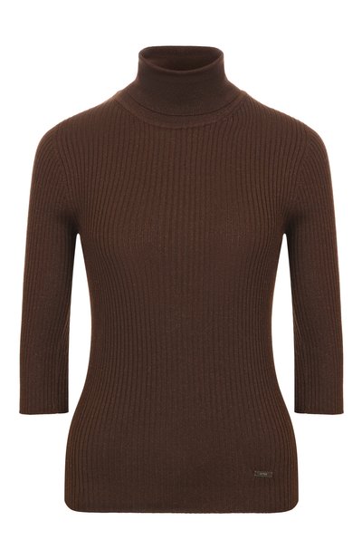 Водолазку с рукавами 3/4 и фирменной пластиной над поясом наши стилисты предлагают носить с шортами, длинным кардиганом и сапогами. В состав пряжи на основе шерсти и вискозы добавили люрекс, который придал облегающей модели в рубчик деликатное мерцание.