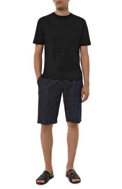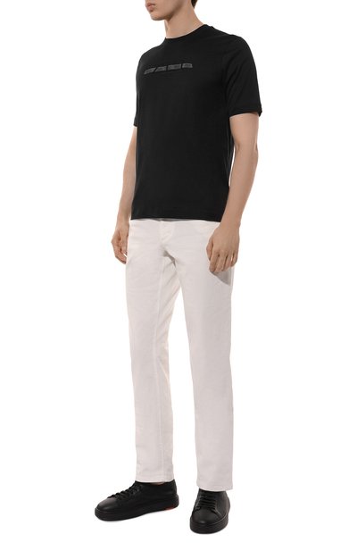 Для создания футболки с круглым вырезом выбрали хлопковое джерси. Лаконичное изделие украсили спереди небольшой контр астной вышивкой в виде логотипа бренда. Модель хорошо рифмуется с джинсами и кедами.