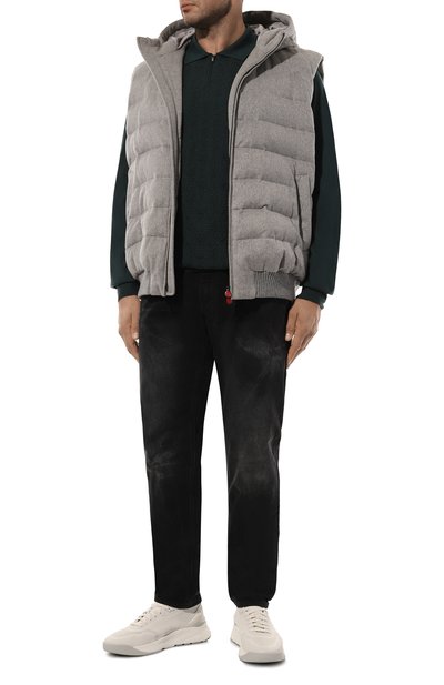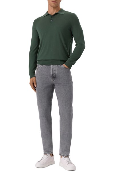 Поло из кашемира, усиленного шелком, органично впишется в повседневный образ с брюками и кроссовками. Планку модели заменили короткой молнией с ярким брендированным пуллером.