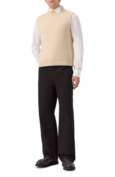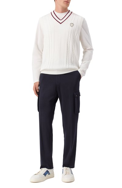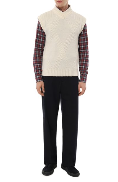 Жилет в стиле униформы студента колледжа изготовили из чистой шерсти. Основу с объемным арановым узором дополнили полосатым кантом, связанным крупной резинкой. На груди модели с V-образной горловиной — квадратный трикотажный патч с логотипом.