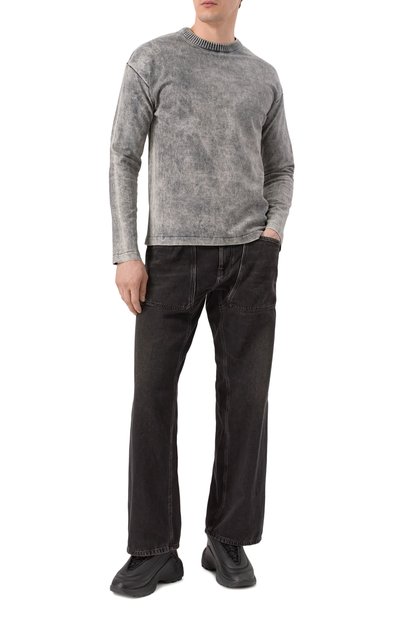 Свитшот со спущенной линией плеч, широкими поясом и манжетами сшили из хлопкового трикотажа. Сзади нанесли крупный принт-логотип, а спереди — его уменьшенную версию.