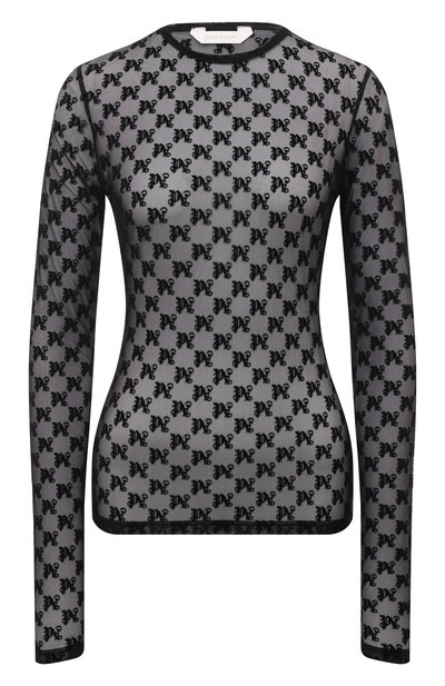 Напоминающий лонгслив полупрозрачный топ с круглым вырезом сшили из эластичного нейлонового тюля с рельефным паттерном из монограммы PA. Предлагаем носить модель с парными брюками, дополнив образ объемным жакетом.