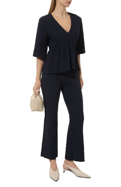 Расклешенные брюки со средней посадкой сшиты из полупрозрачного тонкого фатина с повторяющимися в шахматном порядке логотипами марки. Модель дополнена широким брендированным поясом-резинкой.