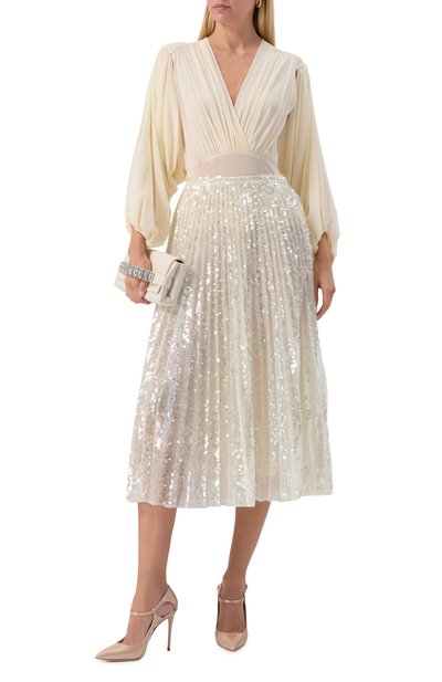 Туфли-лодочки сшили из металлизированной кожи. Ей же обтянули высокую фигурную шпильку. Зауженный мыс акцентировали перфорированным узором, а глубокий вырез подчеркнули зубчатым кантом.