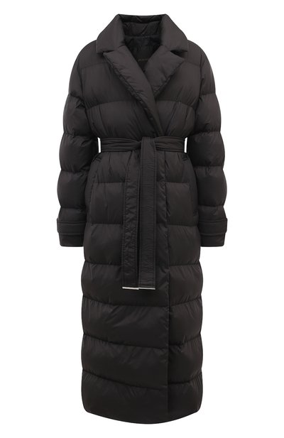 Утепленное стеганое пальто с широкими лацканами выполнили из полиэстера. Изделие застегивается укороченной молнией и кнопочной планкой. Модель с двумя боковыми карманами дополнили съемным поясом-лентой.