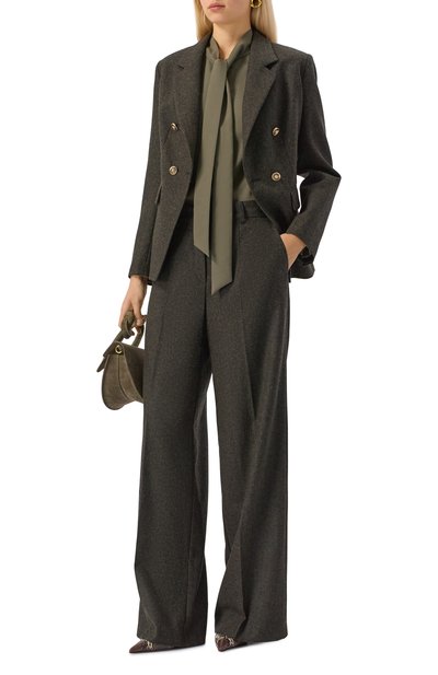 Для пошива широких клетчатых брюк с отворотами и складками под поясом со шлевками для ремня использовали фактурную шерсть с добавлением вискозы. Модель со стрелками и четырьмя карманами предлагаем носить с пуловером и лоферами.