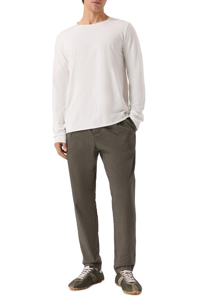 Базовые брюки с четырьмя карманами сшиты из чуть эластичной шерсти. В ткань включили шелк, чтобы модель с отутюженными стрелками стала более мягкой и не пилинговалась.