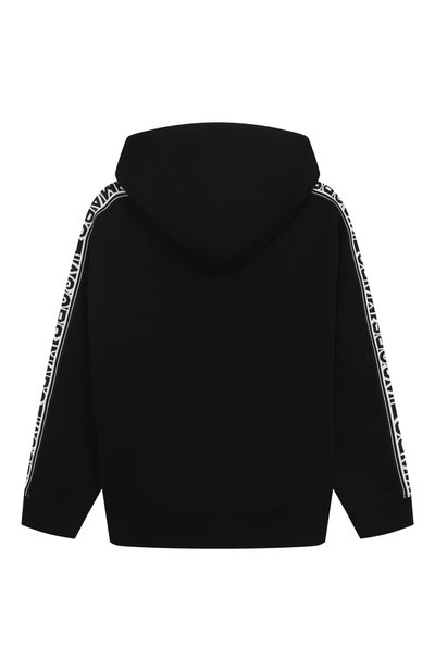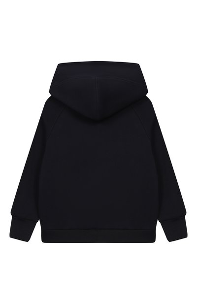 Для пошива толстовки с капюшоном использовали плотный хлопковый трикотаж. Модель декорировали спереди цветной глянцевой эмблемой и мерцающим логотипом.