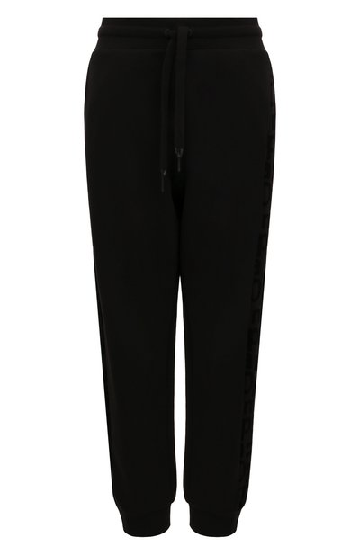 Джоггеры с заниженной линией шагового шва и высокой посадкой выполнили из гладкого хлопкового трикотажа. Модель с регулируемым поясом-кулиской и двумя карманами декорировали фирменной нашивкой сзади и фактурными лампасами.