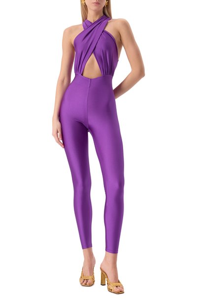 Облегающий комбинезон выполнили из нейлонового джерси стрейч, которое не стесняет движения. Модель с открытой линией плеч украсили на лифе легкой драпировкой и небольшим вырезом.