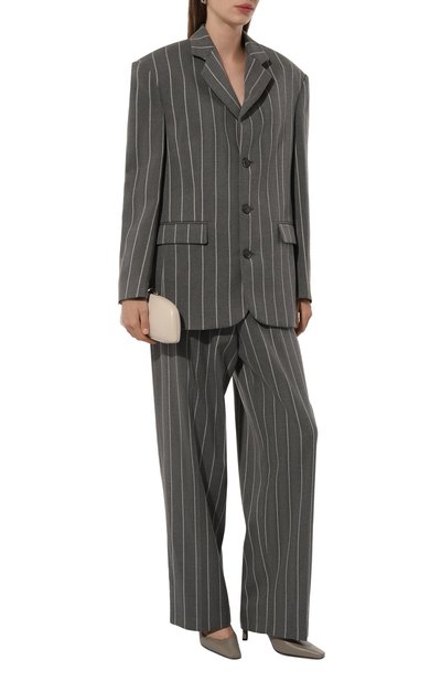 Акцентированные плечи и линии широких лацканов жакета Ottavia в узкую полоску формируют силуэт «песочные часы». Для изготовления модели с двумя прорезными карманами и одной пуговицей использовали костюмную ткань с добавлением вискозы.