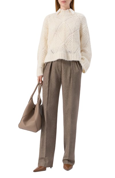 Лаконичные брюки со складками вдоль пояса выполнили из меланжевой ткани на основе вискозы, шерсти и полиэстера. Модель с пятью карманами органично дополнит образ с парным пиджаком, бра и туфлями.