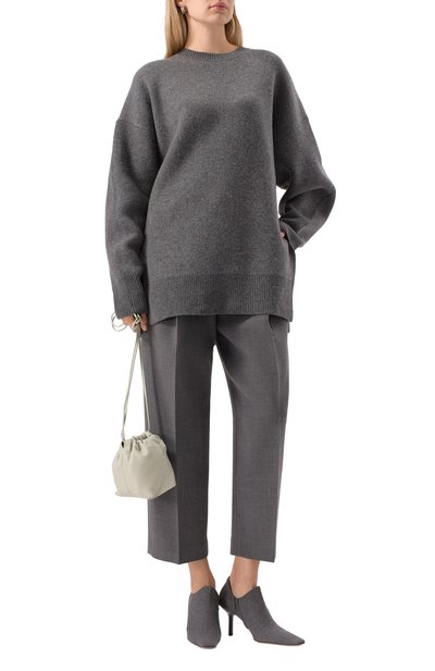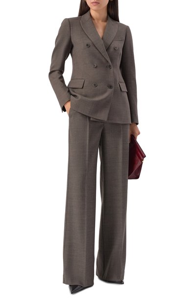Лаконичные брюки со складками вдоль пояса выполнили из меланжевой ткани на основе вискозы, шерсти и полиэстера. Модель с пятью карманами органично дополнит образ с парным пиджаком, бра и туфлями.