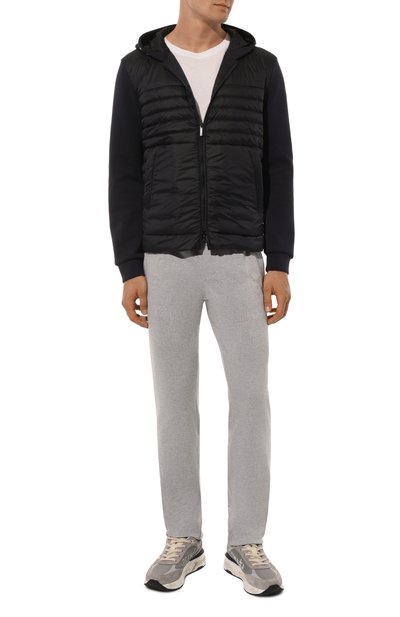 Толстовку с регулируемым капюшоном и двумя карманами, застегивающуюся кнопками, сшили из плотного хлопкового трикотажа. Модель с полосатыми манжетами, поясом и горловиной украсили спереди вышитой эмблемой Академии ВВС Италии и фирменным патчем на рукаве.