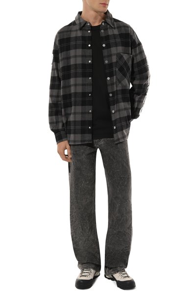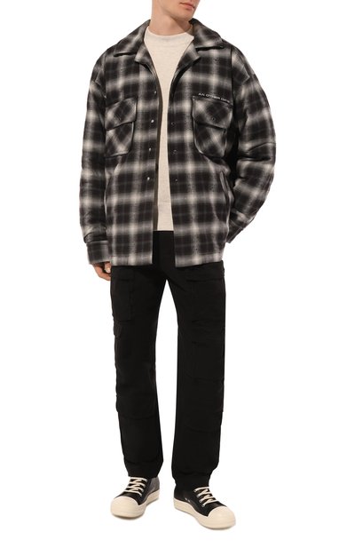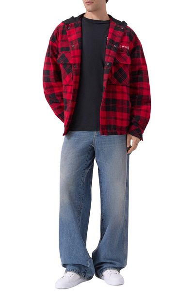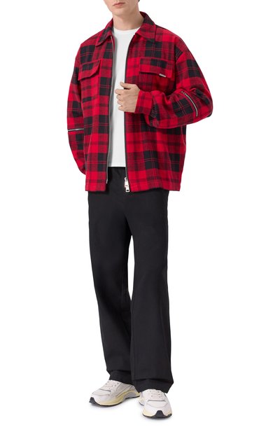 Клетчатую куртку-рубашку сшили из фактурной смесовой фланели на основе хлопка. Модель с накладными карманами и молниями на объемных рукавах декорировали сзади принтом с фирменным плюшевым медведем, рисующим граффити.